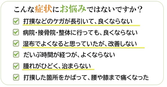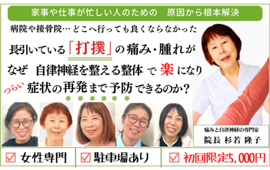 例えば、バドミントンで右膝を痛めた時、整形外科や接骨院に通ってもはかばかしくなくて…。そうだ、杉若先生の所へ!と伺った所、みるみる回復。なので、次にバドミントンで右肩を痛めた時は、迷わずスポーツ会館から電話して翌日の予約を取り付け施術して戴きました。しかしこの時は、帰りの車の運転が難しくなる程、まるで上腕をベルトで固定されたかのように右腕が上がらなくなってしまい、その夜は眠れない位の痛み。翌日には肩回りに青あざが沢山できたので、受傷直後の施術は無理だったのか!?と不安になりましたが、友人Mが、「本当に悪い時程、施術後の痛みが強いけど1~2日で痛みは取れて、見違える程よくなるよ!」と言っていた言葉通り、夕方には痛みが和らぎ、3日おいての施術で殆ど回復しました。以来、間を置かずの治療の方が効果絶大だと実感し、何かあると直ぐに通うようになりました。