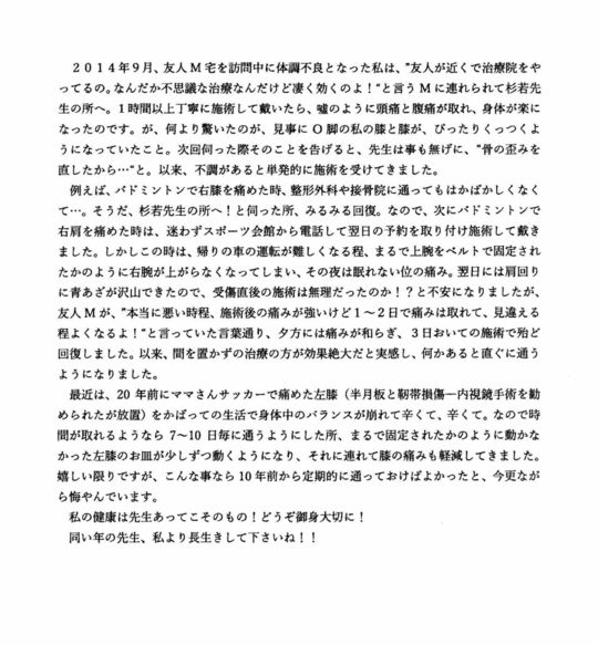 2014年9月、友人M宅を訪問中に体調不良となった私は、「友人が近くで治療院をやってるの。なんだか不思議な治療なんだけど凄く効くのよ!」と言うMに連れられて杉若先生の所へ。1時間以上丁寧に施術して戴いたら、噓のように頭痛と腹痛が取れ、身体が楽になったのです。が、何より驚いたのが、見事にO脚の私の膝と膝が、ぴったりくっつくようになっていたこと。次回伺った際そのことを告げると、先生は事も無げに、「骨の歪みを直したから…」と。以来、不調があると単発的に施術を受けてきました。