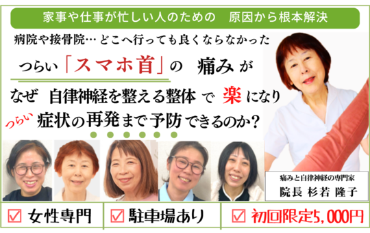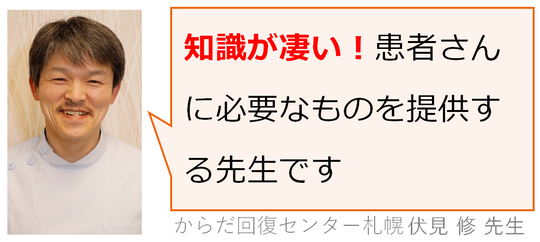 杉若さんに会った時、初めて苦しみ、辛さを分かってくれる人に出会えた気がしたのを覚えています。「どうしたら患者の痛さや苦しみを取り除けるのか」 そのことを親身になって考え、より良い治療方法を常に勉強してくれているのが分かります。患者として受け身だけではなく、自分でも気をつけなければいけないことは気をつけ、実践できることは実践するようにしています。元気になって、自分が活かされていることに感謝して前向きに生きていきたいと思っています。このように考えられるのは身体がしっかりしてきたからだなぁと思います。