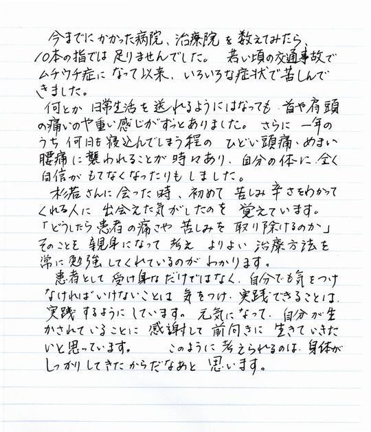 杉若さんに会った時、初めて苦しみ、辛さを分かってくれる人に出会えた気がしたのを覚えています。「どうしたら患者の痛さや苦しみを取り除けるのか」 そのことを親身になって考え、より良い治療方法を常に勉強してくれているのが分かります。患者として受け身だけではなく、自分でも気をつけなければいけないことは気をつけ、実践できることは実践するようにしています。元気になって、自分が活かされていることに感謝して前向きに生きていきたいと思っています。このように考えられるのは身体がしっかりしてきたからだなぁと思います。