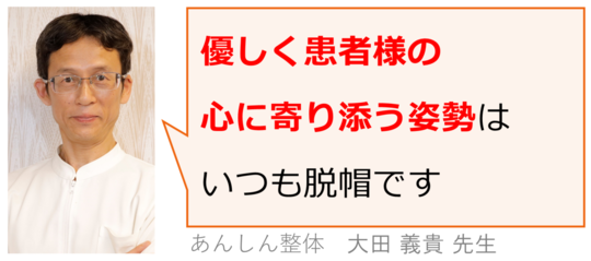 最近は、20年前にママさんサッカーで痛めた左膝(半月板と靭帯損傷―内視鏡手術を勧められたが放置)をかばっての生活で身体中のバランスが崩れて辛くて、辛くて。なので時間が取れるようなら7~10日毎に通うようにした所、まるで固定されたかのように動かなかった左膝のお皿が少しずつ動くようになり、それに連れて膝の痛みも軽減してきました。嬉しい限りですが、こんな事なら10年前から定期的に通っておけばよかったと、今更ながら悔やんでいます。私の健康は先生あってこそのもの!どうぞ御身大切に! 同い年の先生、私より長生きして下さいね!!