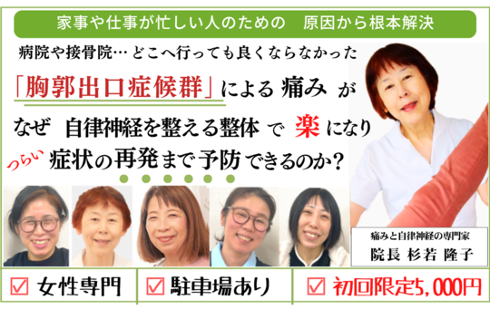 杉若さんに会った時、初めて苦しみ、辛さを分かってくれる人に出会えた気がしたのを覚えています。「どうしたら患者の痛さや苦しみを取り除けるのか」 そのことを親身になって考え、より良い治療方法を常に勉強してくれているのが分かります。患者として受け身だけではなく、自分でも気をつけなければいけないことは気をつけ、実践できることは実践するようにしています。元気になって、自分が活かされていることに感謝して前向きに生きていきたいと思っています。このように考えられるのは身体がしっかりしてきたからだなぁと思います。
