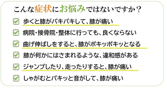 膝関節屈伸時にクリック感(引っかかる感じ)があり雑音を聴く事があります。