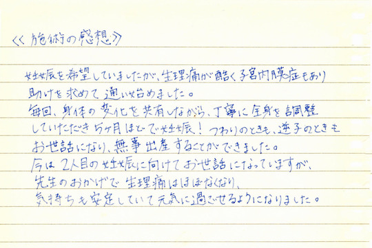 妊娠を希望していましたが、生理痛が酷く、子宮内膜症もあり、助けを求めて通い始めました。毎回、身体の変化を共有しながら、丁寧に全身を調整して頂き、5ヶ月ほどで妊娠! つわりの時も逆子の時もお世話になり、無事、出産することができました。今は二人目の妊娠に向けてお世話になっていますが、先生のお陰で生理痛はほぼなくなり、気持ちも安定していて元気に過ごせるようになりました。