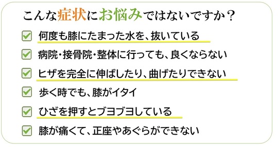 水が溜まっているせいで膝が曲げにくかったりします。症状として、膝周辺に腫れや痛み、膝を押すとぶよぶよしたり、突然膝に痛みが出る事があります。