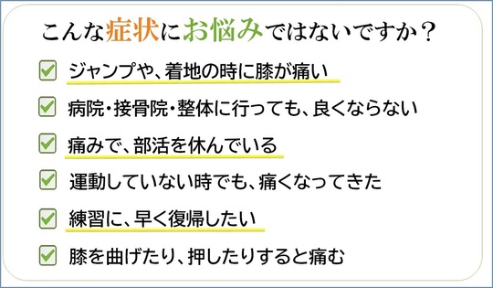 膝の皿とすねの骨をつなぐ膝蓋腱が傷つき、炎症が起きている症状です。重症例では腱が完全に切れてしまう「膝蓋腱断裂」になってしまうケースもあります。