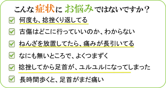階段を踏み外した、スポーツをやっていた時に転倒したなど私たちにとって一番身近なお怪我かもしれません。腰や肩などの不調も土台となる足が原因の事もありますのでしっかり見直してみませんか?