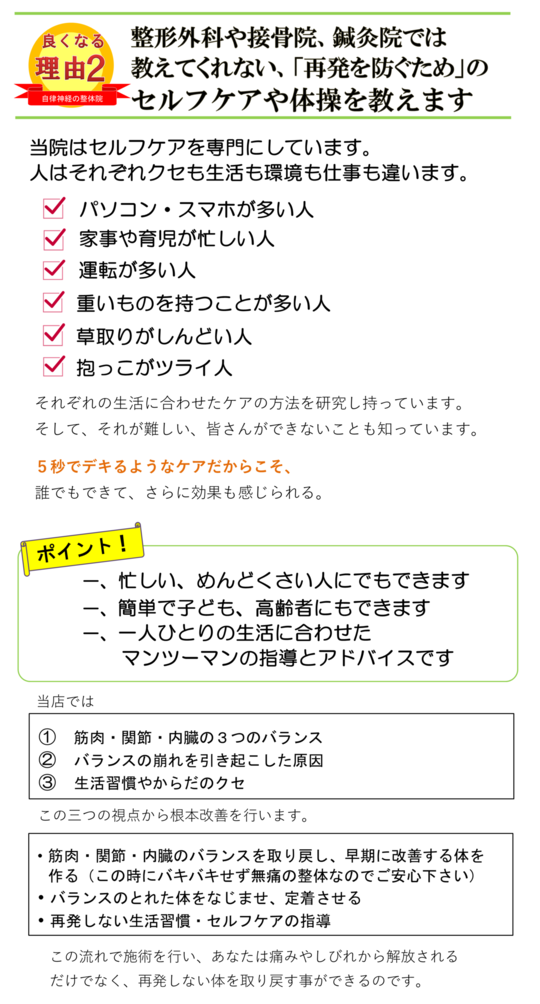 当院では全身のチェックと丁寧なカウンセリングで、あなたの頭痛の根本的な原因を探し、施術します。また全身を調整し自律神経を整えていくことで、身体の免疫力が高められるので、再発予防にもなります。