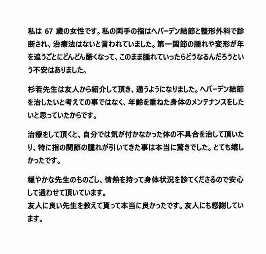 私は67才の女性です。私の両手の指はヘパーデン結節と整形外科で診断され、治療法はないと言われていました。第一関節の腫れや変形が年を追うごとにどんどん酷くなって、このまま腫れていったらどうなるんだろうという不安がありました。杉若先生は、友人から紹介して頂き、通うようになりました。ヘパーデン結節を治したいと考えてのことではなく、年齢を重ねた身体のメンテナンスをしたいと思っていたからです。治療をして頂くと、自分では気がつかなかった身体の不具合を治して頂いたり、特に指の関節の腫れが引いてきたことは本当に驚きでした。とても嬉しかったです。  穏やかな先生のものごし、情熱を持って身体状況を診て下さるので安心して通わせて頂いています。友人に良い先生を教えて貰って本当に良かったです。友人にも感謝しています。